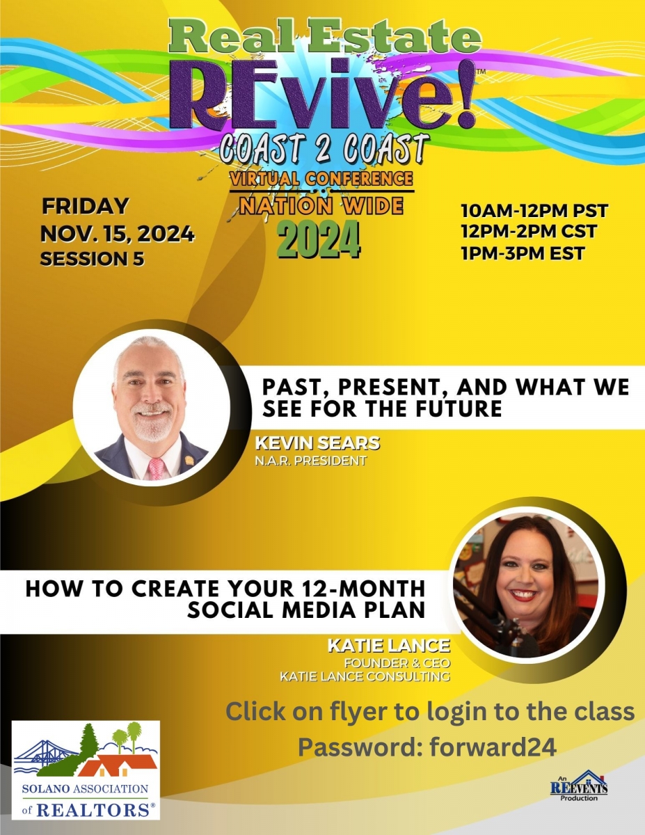 Date: Friday, November 15, 2024 - 10:00amPlace: Virtual - online Real Estate Revive Cost 2 Cost Virtual Conference Nation Wide 2024 Click on Flier to attend class (enter password below to gain access) Password : forward2024 Event Type: Regular Event
